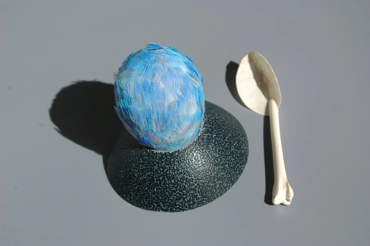 Others Peacock shell 2024 Peacock and hackle feathers, and shell 10x24x16cm $850 Bunnikeets 2022, Lorikeet Feathers and mixed media Both 11x8x7cm $600each $1100 pair Sold Flying Crocodiles 2022 Set of 3 for the wall Feathers and Mixed media, approx 11x10cm each RRP$135 set Flying Turatara 2022 Set of 3 for the wall, Feathers and Mixed media, approx 11x13cm each RRP$135 set The chicken or the Egg? 2013 Rozella feathers, Emu egg shell, Seagull bones and mixed media Height;10 cm RRP $750 (Photo; John Lee) Sold What Came First? 2004 Budgie feathers, emu egg shell, seagull bones.